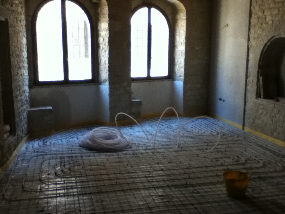 Abitazione situata in pieno centro storico di Gubbio, nella via principale, ristrutturata completamente, con impianto di climatizzazione a pannelli radianti a pavimento ed in parte a parete. La deumidificazione, durante il periodo di raffrescamento, avviene per mezzo di ventilconvettori canalizzati installati nel controsoffitto dei disimpegni. L’edificio è stato ristrutturato e pertanto le murature esterne ed il tetto sono stati coibentati per poter ottenere un considerevole risparmio energetico. In tal modo è stato possibile abbassare la temperatura di mandata dell’impianto termico, diminuendo ulteriormente i consumi.